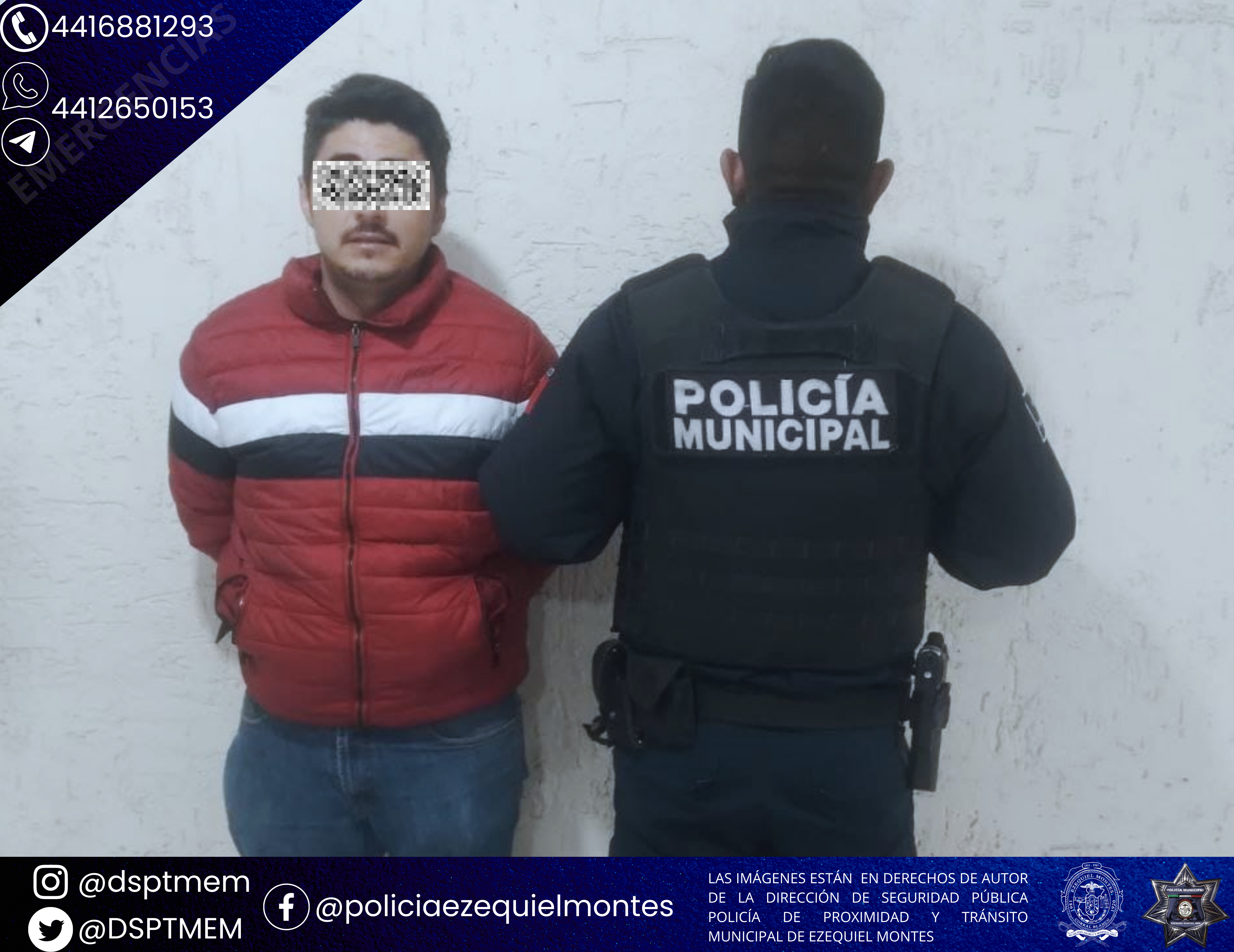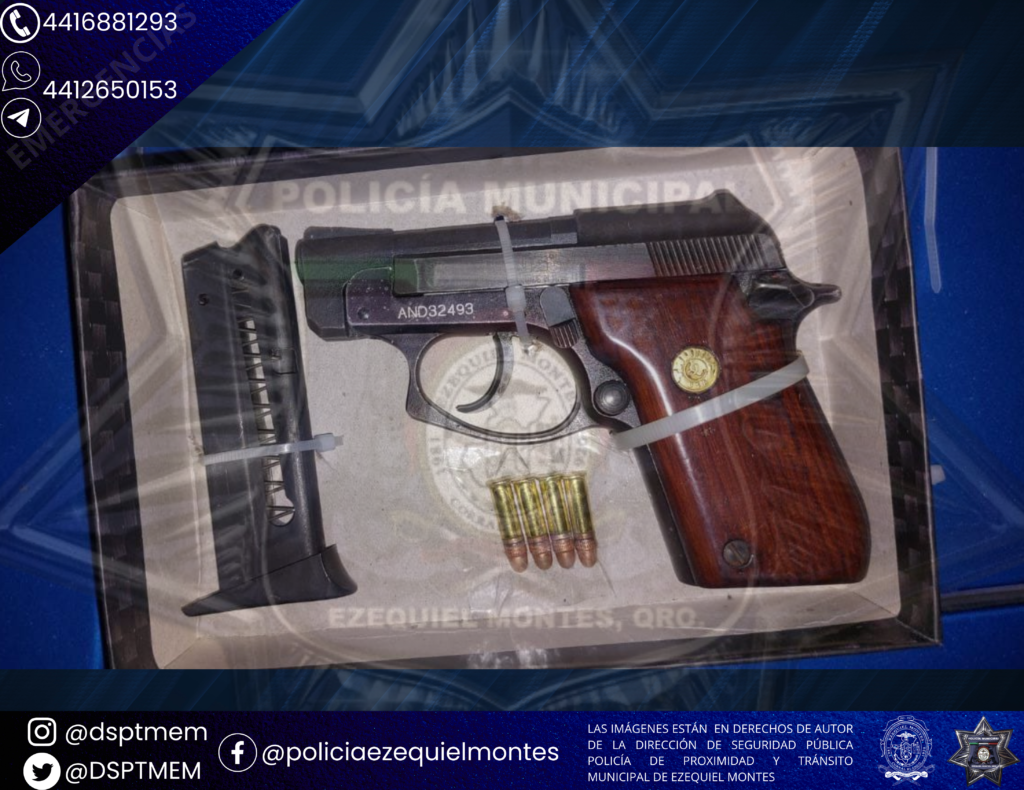 Resultados de las acciones para inhibir delitos y faltas administrativas, por recorridos de seguridad y vigilancia de elementos de La Dirección de Seguridad Pública, Policía de Proximidad y Tránsito Municipal de Ezequiel Montes, realizaron la detención de un masculino quien dijo ser llamado Marco “N” quien fue puesto a disposición de la Fiscalía General de la República (FGR), por el delito de Portación de Arma de Fuego sin licencia.